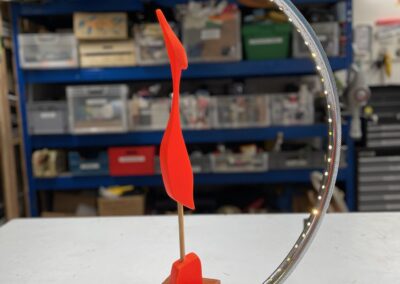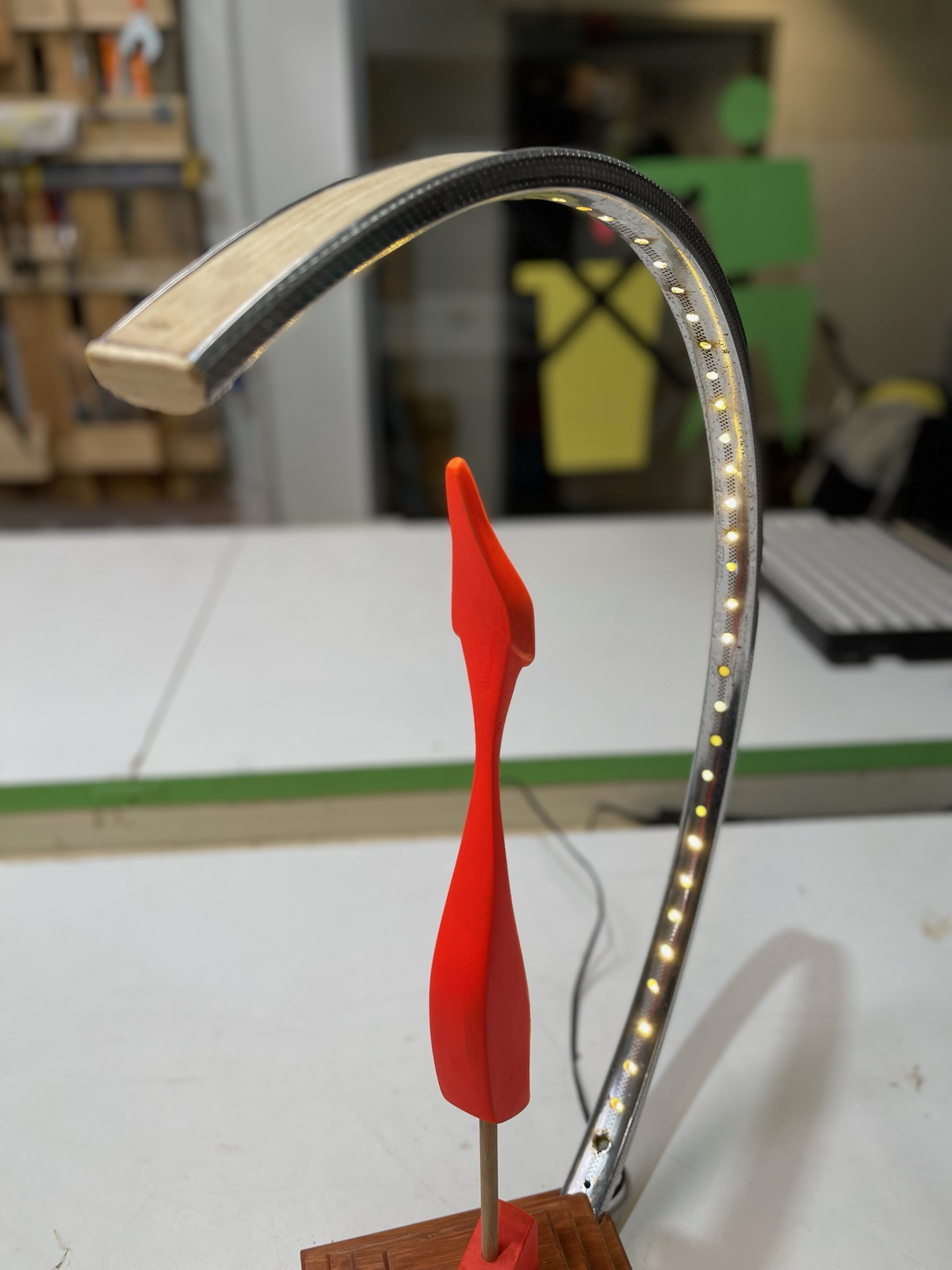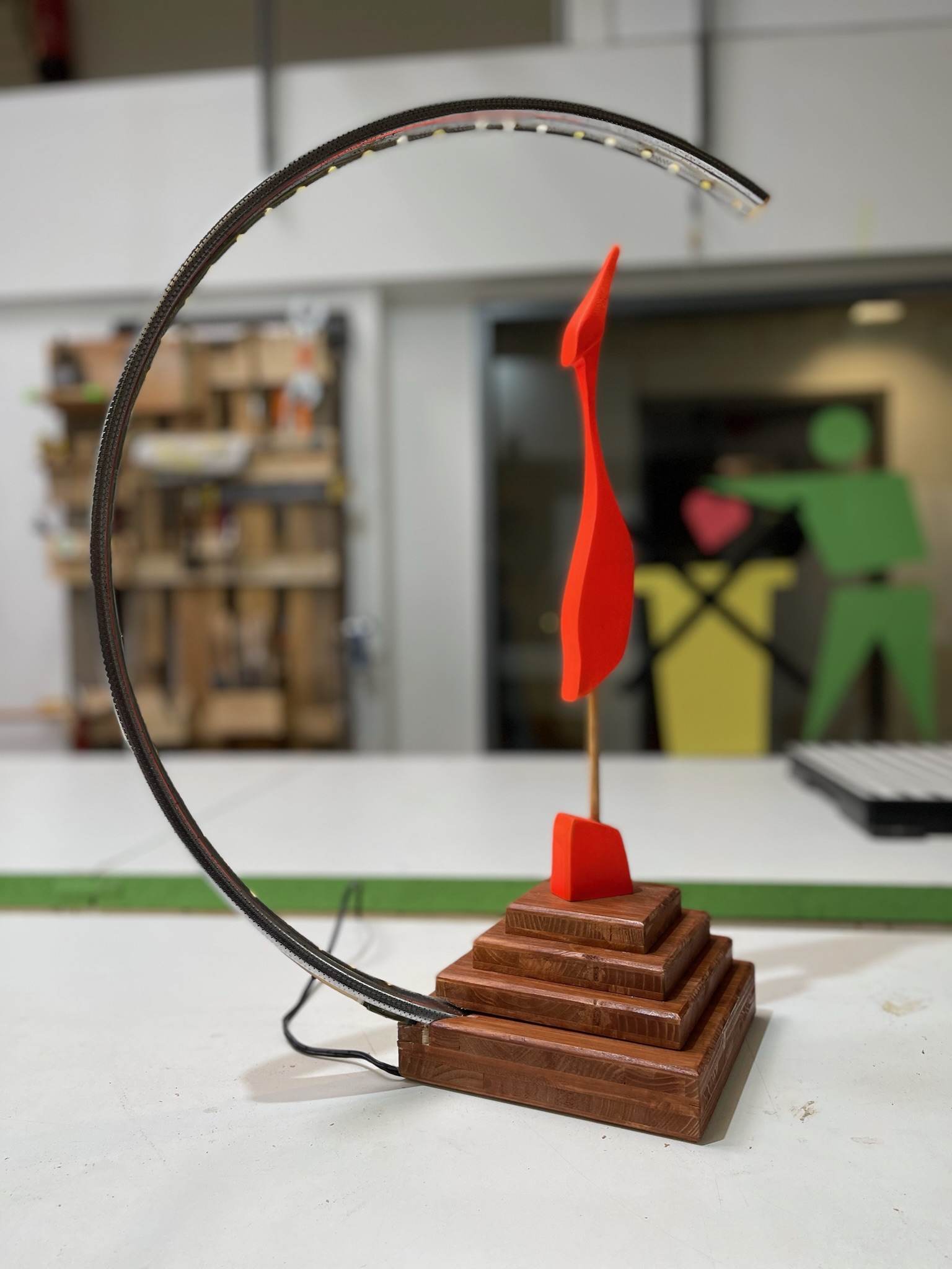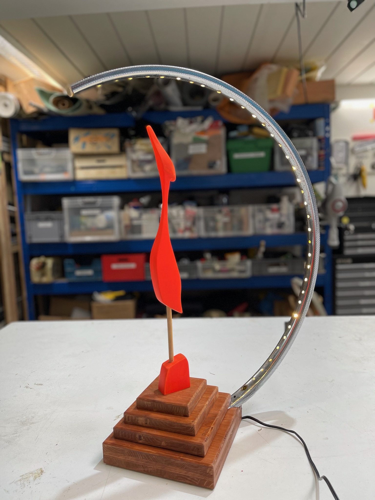 Gefundene Skulptur aufgearbeitet und in LED-Upcycling-Felgenlampe integriert
